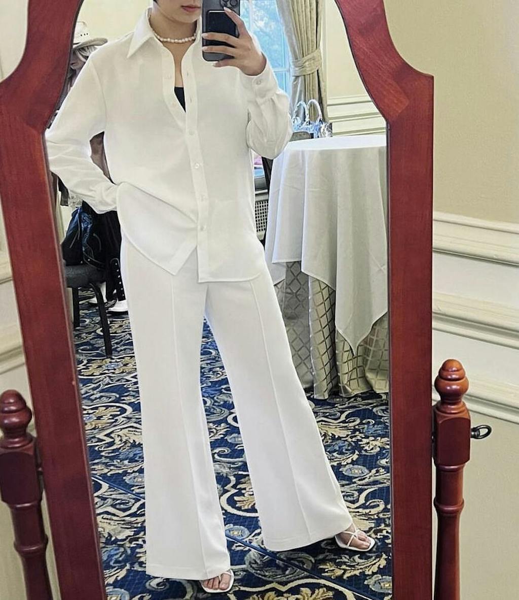 Our fabulous Sophia Pant available in crepe. This pant is characterized by its beautiful drape with a close fit at the top and a graceful transition to flared leg openings. These wide-leg pants are versatile - suitable for an elegant evening outfit or effortlessly enhancing the appeal of a crisp T-shirt. Pair with our matching Grace Crepe Shirt to complete the look.